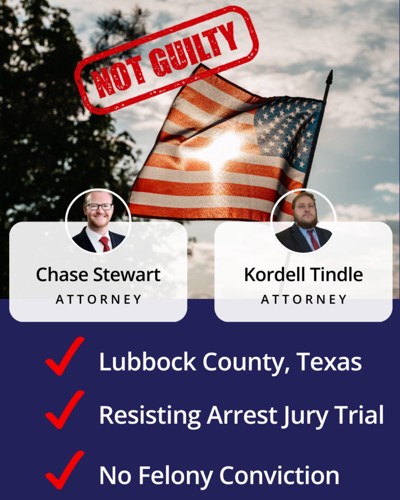 Dunham & Jones attorneys Chase Stewart and Kordell Tindle secured a Not Guilty verdict in a resisting arrest jury trial in Lubbock, Texas in 2025. The case was tried before a Lubbock County jury and concluded with a swift acquittal after only several minutes of deliberation.
