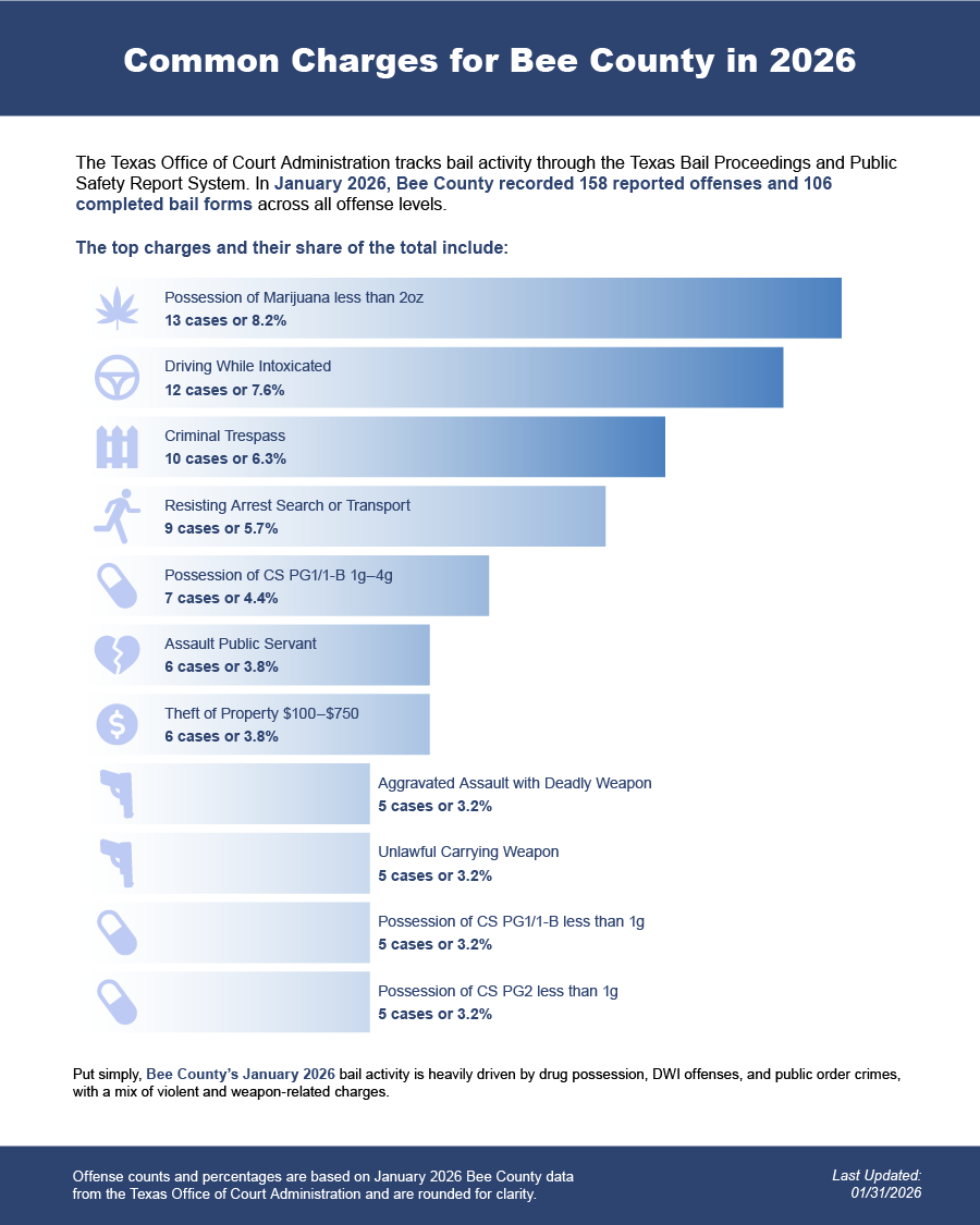 Bail bonds in Bee County, Texas may include felony bail bonds, misdemeanor bail bonds, and DWI bail bonds, depending on the charge and court requirements.