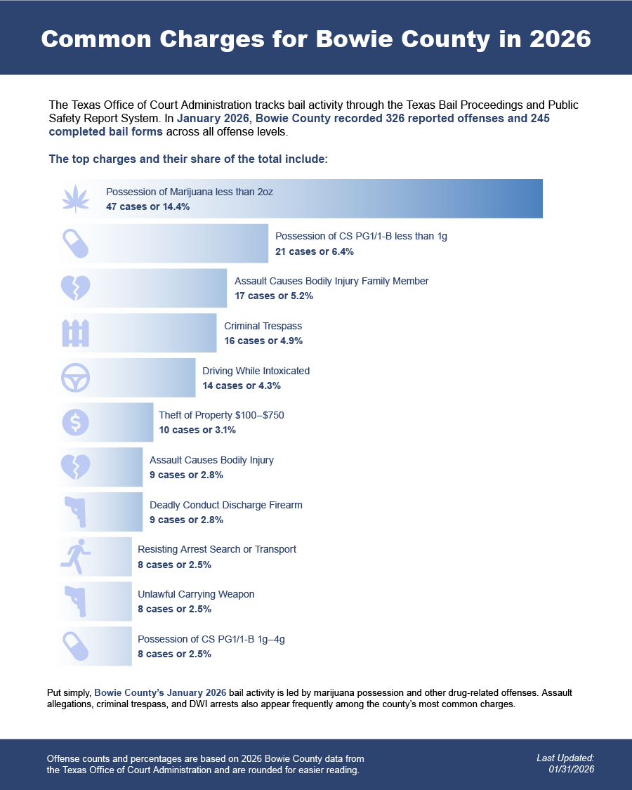 Bail bonds in Bowie County, Texas may include felony bail bonds, misdemeanor bail bonds, and DWI bail bonds, depending on the charge and court requirements.