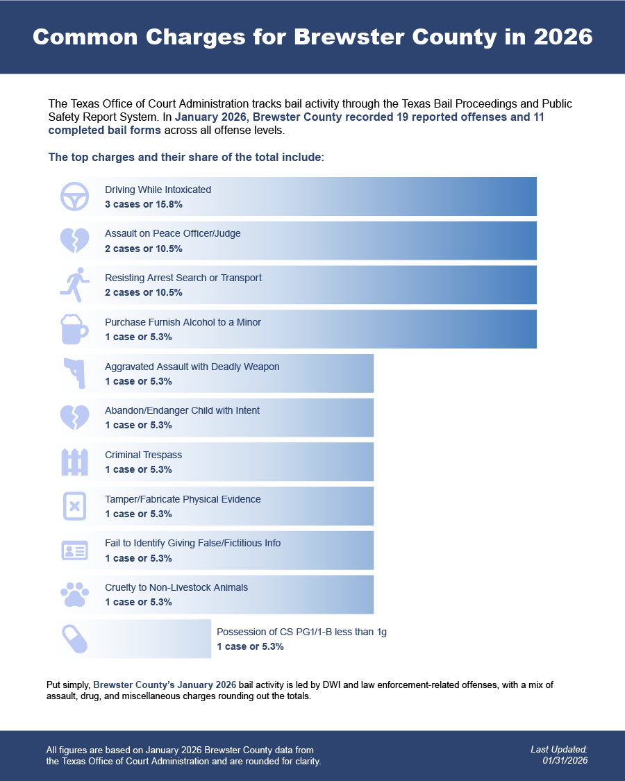 Bail bonds in Brewster County, Texas may include felony bail bonds, misdemeanor bail bonds, and DWI bail bonds, depending on the charge and court requirements.