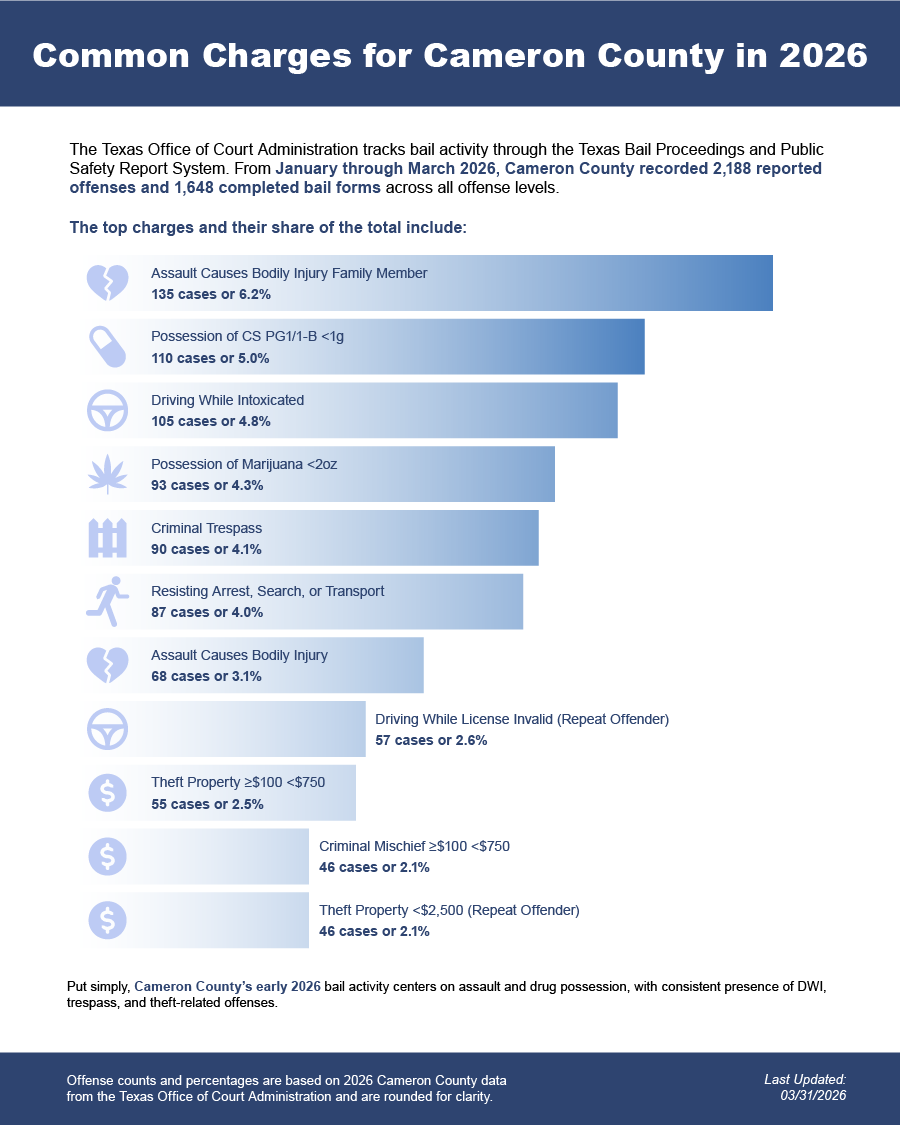 Bail bonds in Cameron County, Texas may include felony bail bonds, misdemeanor bail bonds, and DWI bail bonds, depending on the charge and court requirements.