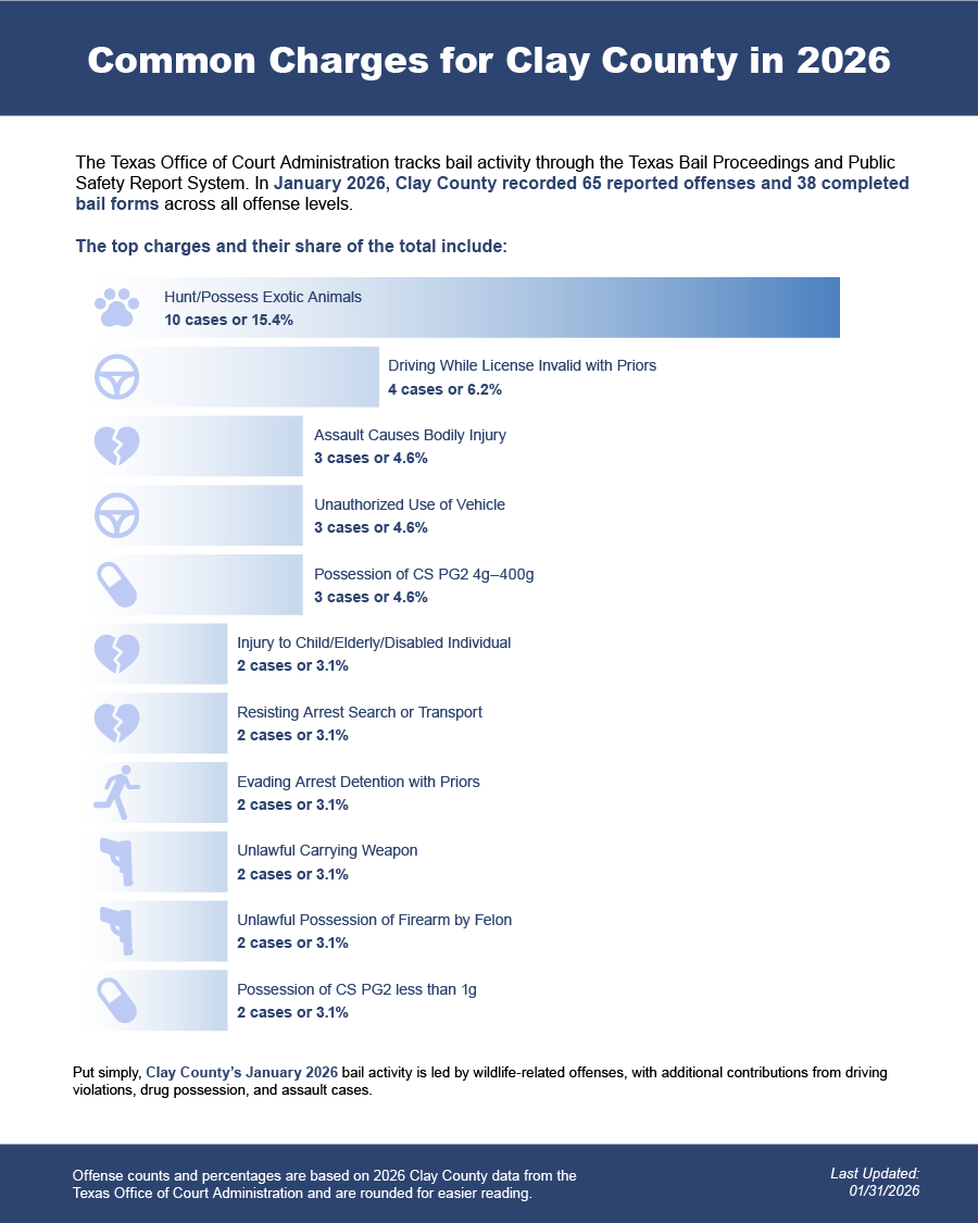 Bail bonds in Clay County, Texas may include felony bail bonds, misdemeanor bail bonds, and DWI bail bonds, depending on the charge and court requirements.