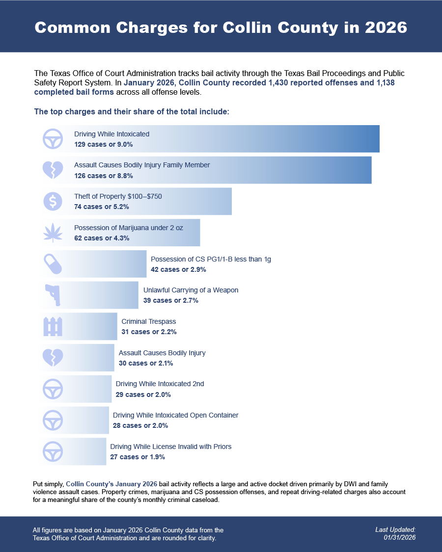 In other words, about one out of every five Collin County arrests involved either DWI or theft crimes. Other frequent arrest categories included family-violence assault, controlled substance offenses, marijuana possession, and evading arrest. These are the types of cases where bail can be set quickly after booking, and where bond conditions, court dates, and the total bond amount can directly affect the timeline and cost of release.