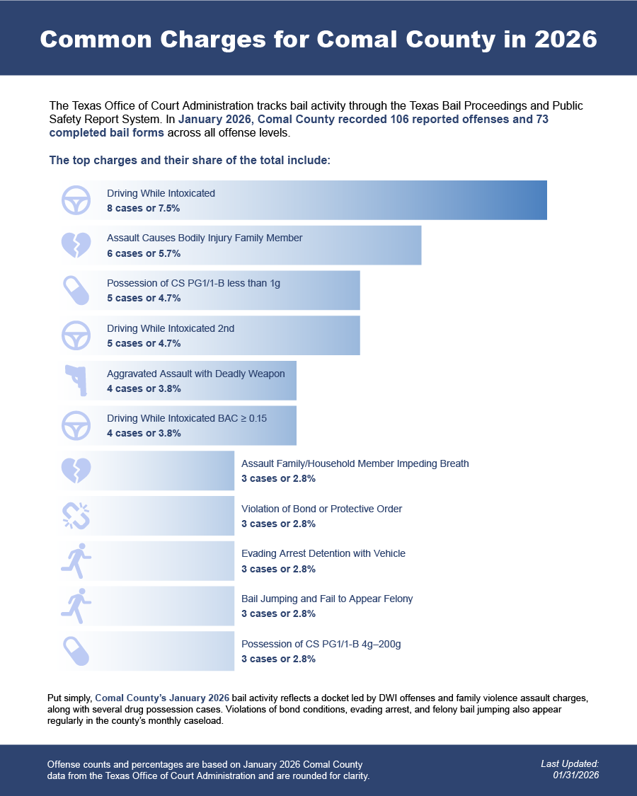Bail bonds in Comal County, Texas may include felony bail bonds, misdemeanor bail bonds, and DWI bail bonds, depending on the charge and court requirements.