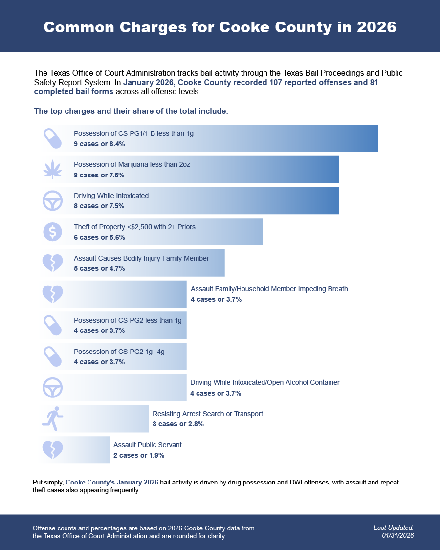 Bail bonds in Cooke County, Texas may include felony bail bonds, misdemeanor bail bonds, and DWI bail bonds, depending on the charge and court requirements.