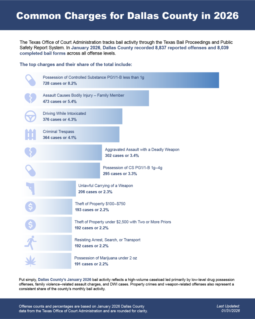 After an arrest or warrant processing, a judge sets bail based on a bail schedule or on a case-by-case review. If the full bail amount cannot be paid directly to the court, a bail bond company may post a surety bond, guaranteeing the defendant’s appearance in court. In Dallas County, surety bonds for county cases are processed through the Sheriff’s bond administration system, while some municipal courts handle bonds separately.