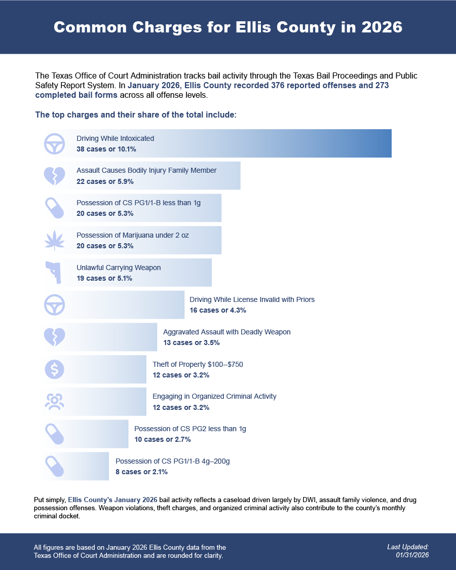 Contact Dunham & Jones to understand how the bail process works in Ellis County and what options may be available. In many situations, the bail bond process can begin shortly after initial contact, allowing coordination with a bond agent once bail is set and the necessary paperwork is identified. - Review Bail Options