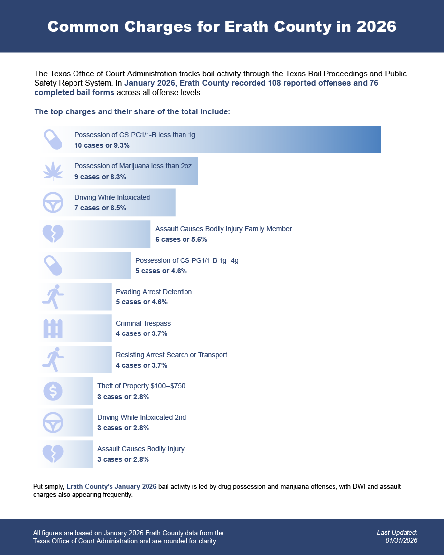Bail bonds in Erath County, Texas may include felony bail bonds, misdemeanor bail bonds, and DWI bail bonds, depending on the charge and court requirements.