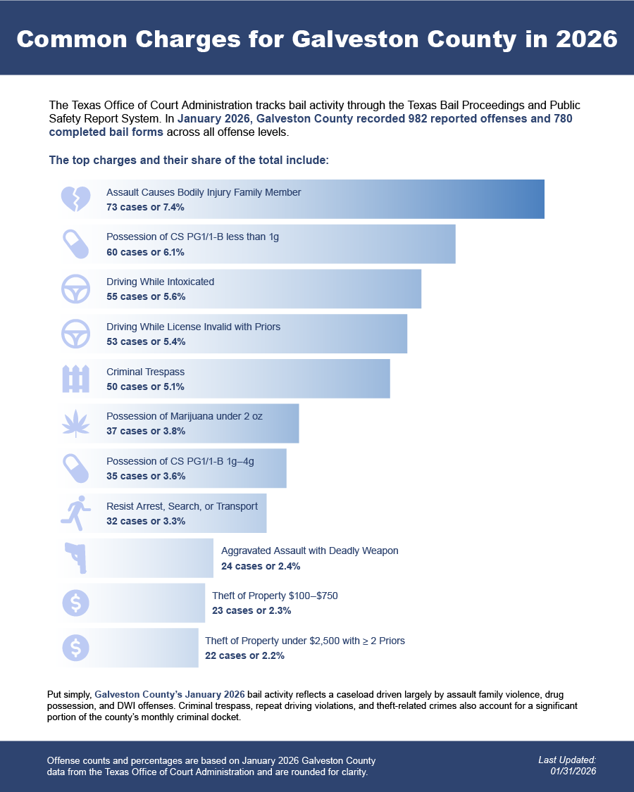 Bail bonds in Galveston County, Texas may include felony bail bonds, misdemeanor bail bonds, and DWI bail bonds, depending on the charge and court requirements.