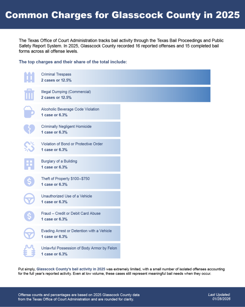 Bail bonds in Glasscock County, Texas may include felony bail bonds, misdemeanor bail bonds, and DWI bail bonds, depending on the charge and court requirements.