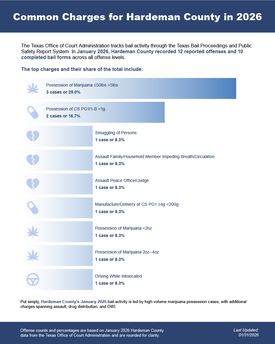 Bail bonds in Hardeman County, Texas may include felony bail bonds, misdemeanor bail bonds, and DWI bail bonds, depending on the charge and court requirements.