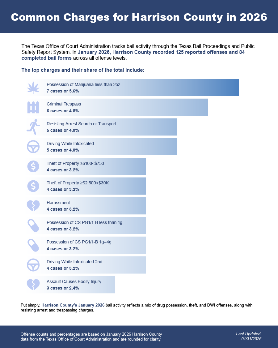 Bail bonds in Harrison County, Texas may include felony bail bonds, misdemeanor bail bonds, and DWI bail bonds, depending on the charge and court requirements.