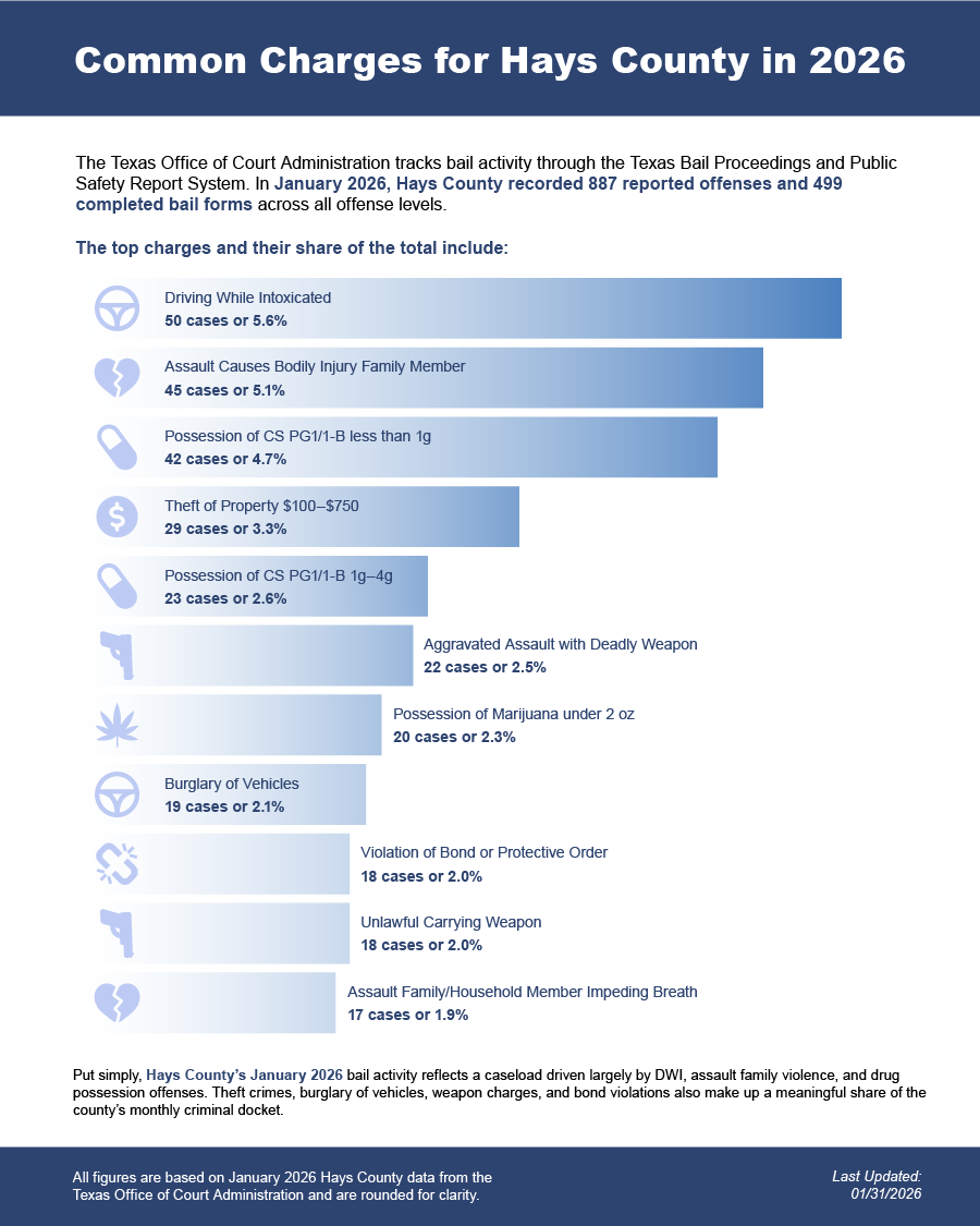 Bail bonds in Hays County, Texas may include felony bail bonds, misdemeanor bail bonds, and DWI bail bonds, depending on the charge and court requirements.