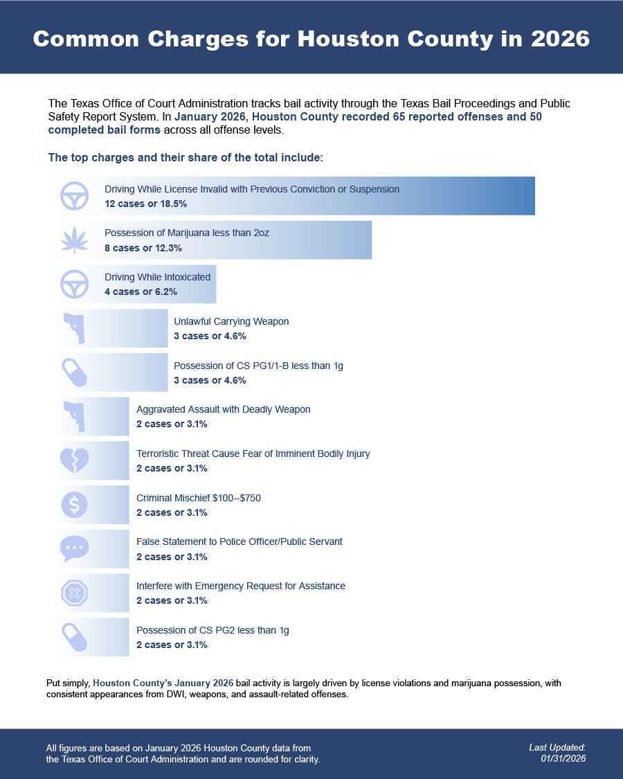 Bail bonds in Houston County, Texas may include felony bail bonds, misdemeanor bail bonds, and DWI bail bonds, depending on the charge and court requirements.