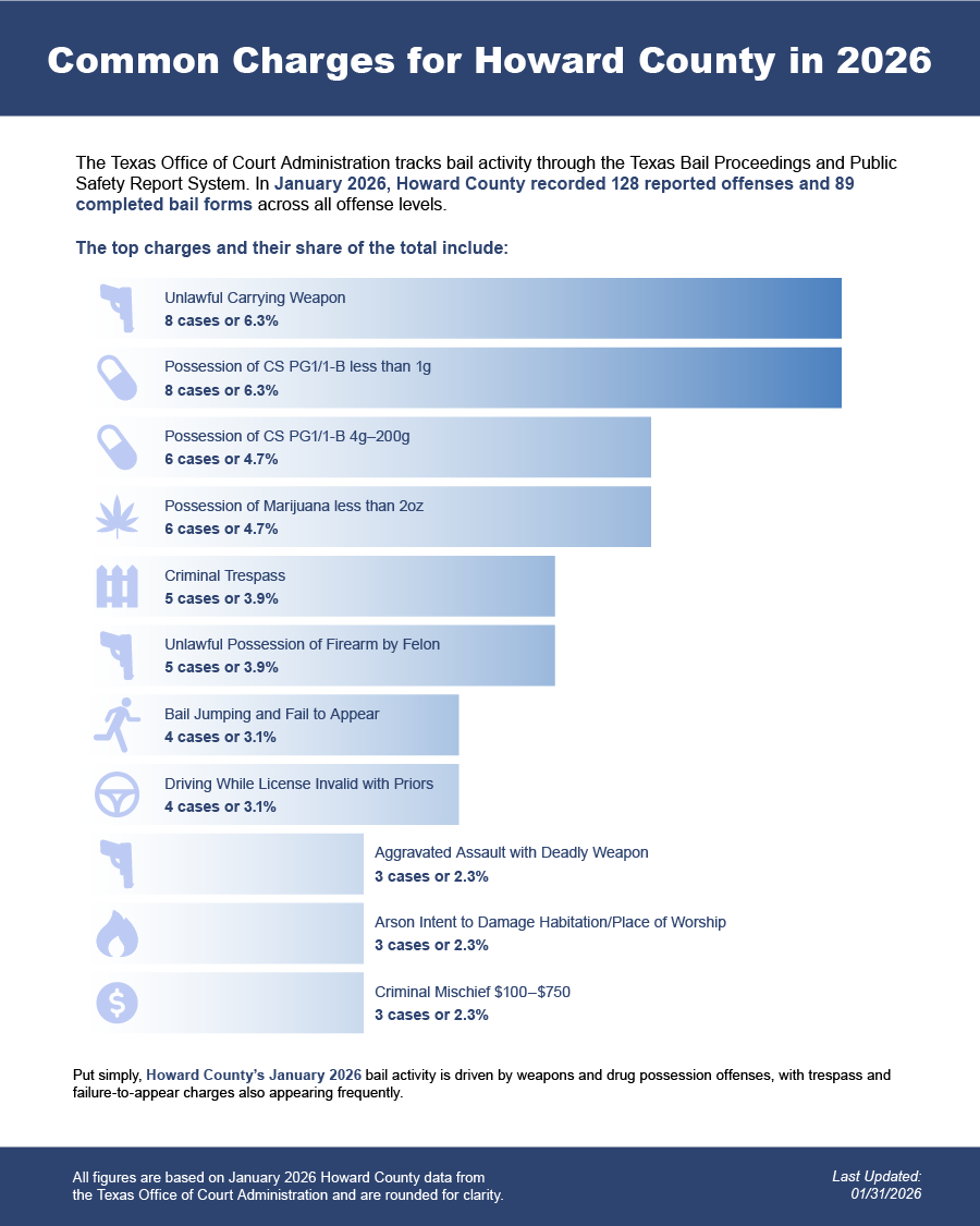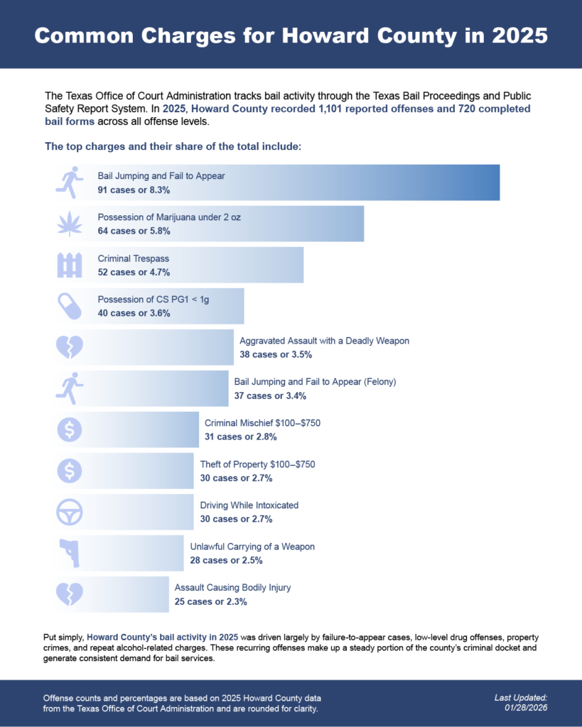 Bail bonds in Howard County, Texas may include felony bail bonds, misdemeanor bail bonds, and DWI bail bonds, depending on the charge and court requirements.