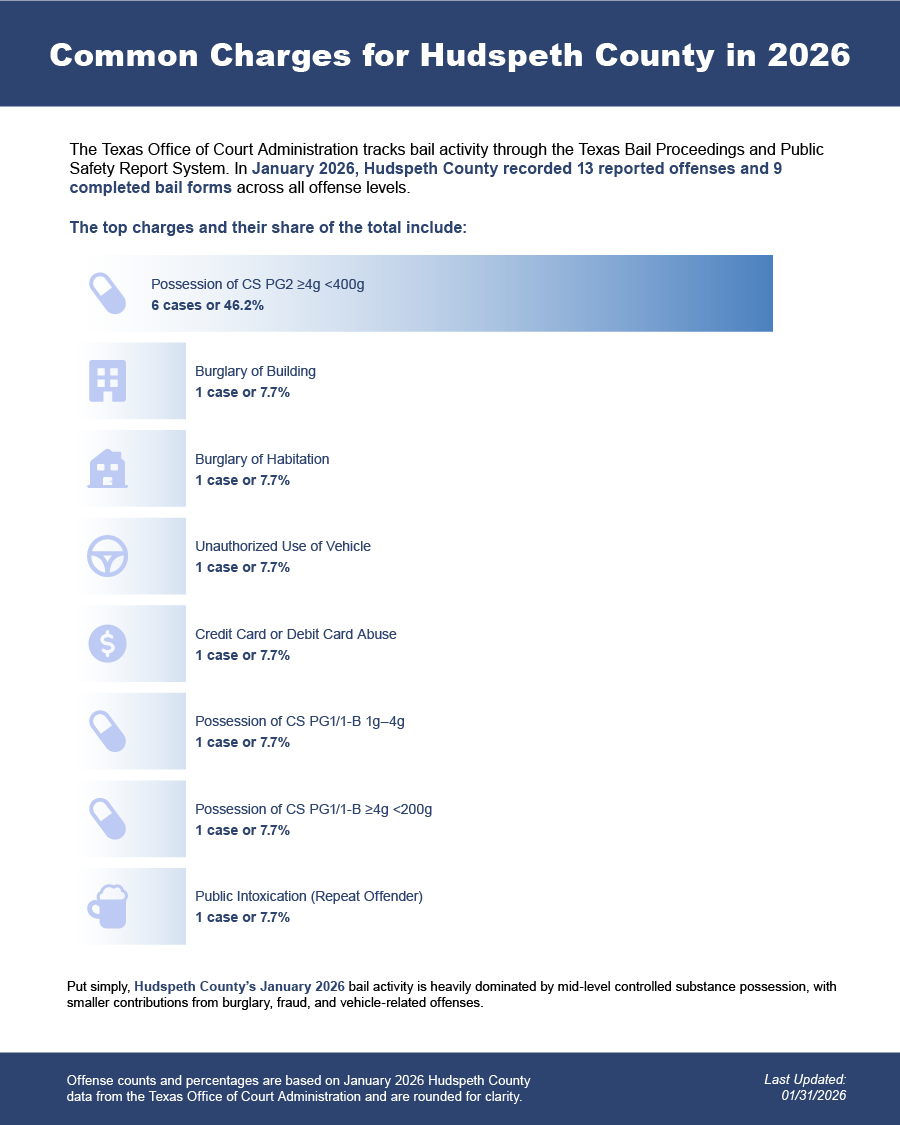 After an arrest in Hudspeth County, the booking process includes fingerprinting, photographing, and intake at a county detention facility such as the Hudspeth County County Jail. This process typically takes several hours. A magistrate or judge reviews the charge and sets bail, usually within 48 hours of arrest, either under a standard bail schedule or through a case-by-case review that considers the seriousness of the offense and the defendant’s history. - Contact Legal Guidance
