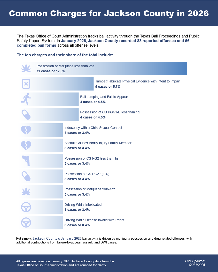 Bail bonds in Jackson County, Texas may include felony bail bonds, misdemeanor bail bonds, and DWI bail bonds, depending on the charge and court requirements.