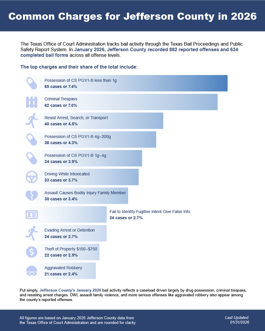 Bail bonds in Jefferson County, Texas may include felony bail bonds, misdemeanor bail bonds, and DWI bail bonds, depending on the charge and court requirements.