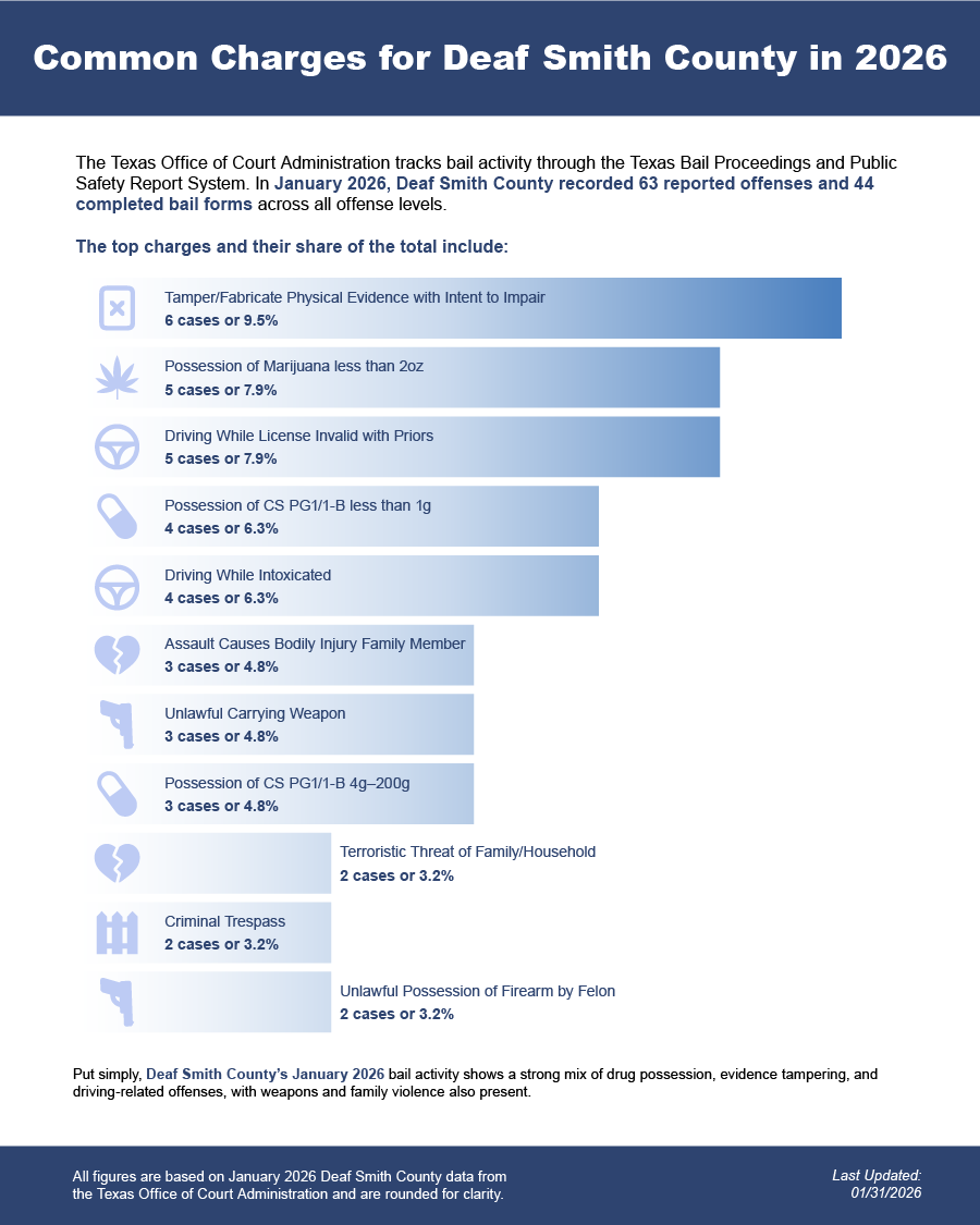 Bail bonds in Jones County, Texas may include felony bail bonds, misdemeanor bail bonds, and DWI bail bonds, depending on the charge and court requirements.
