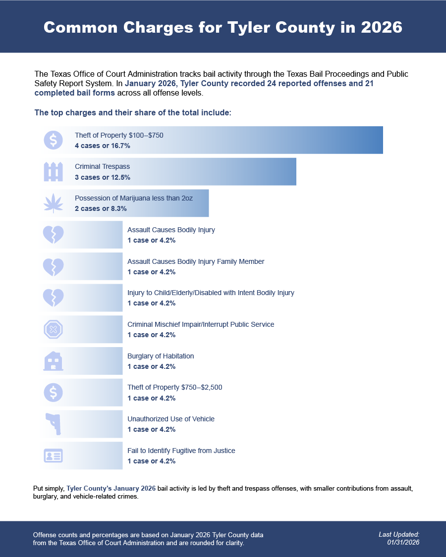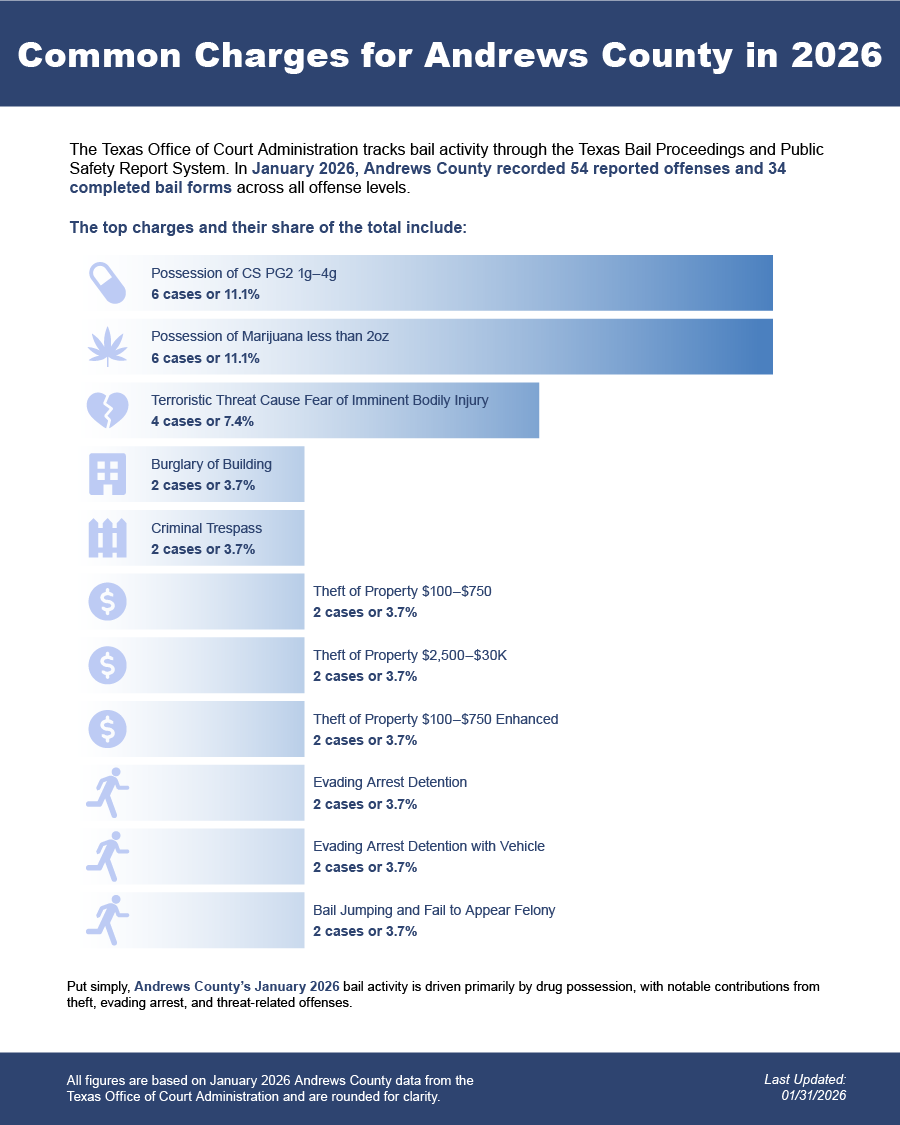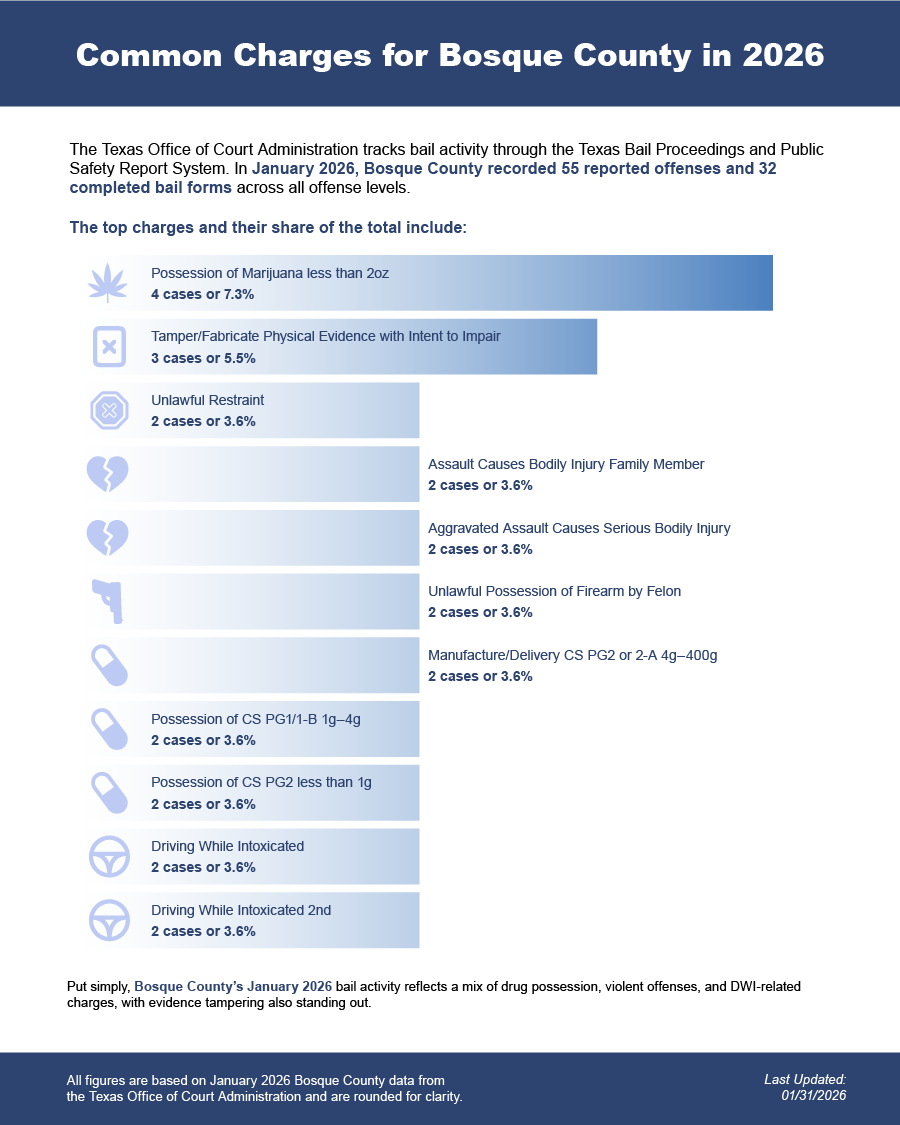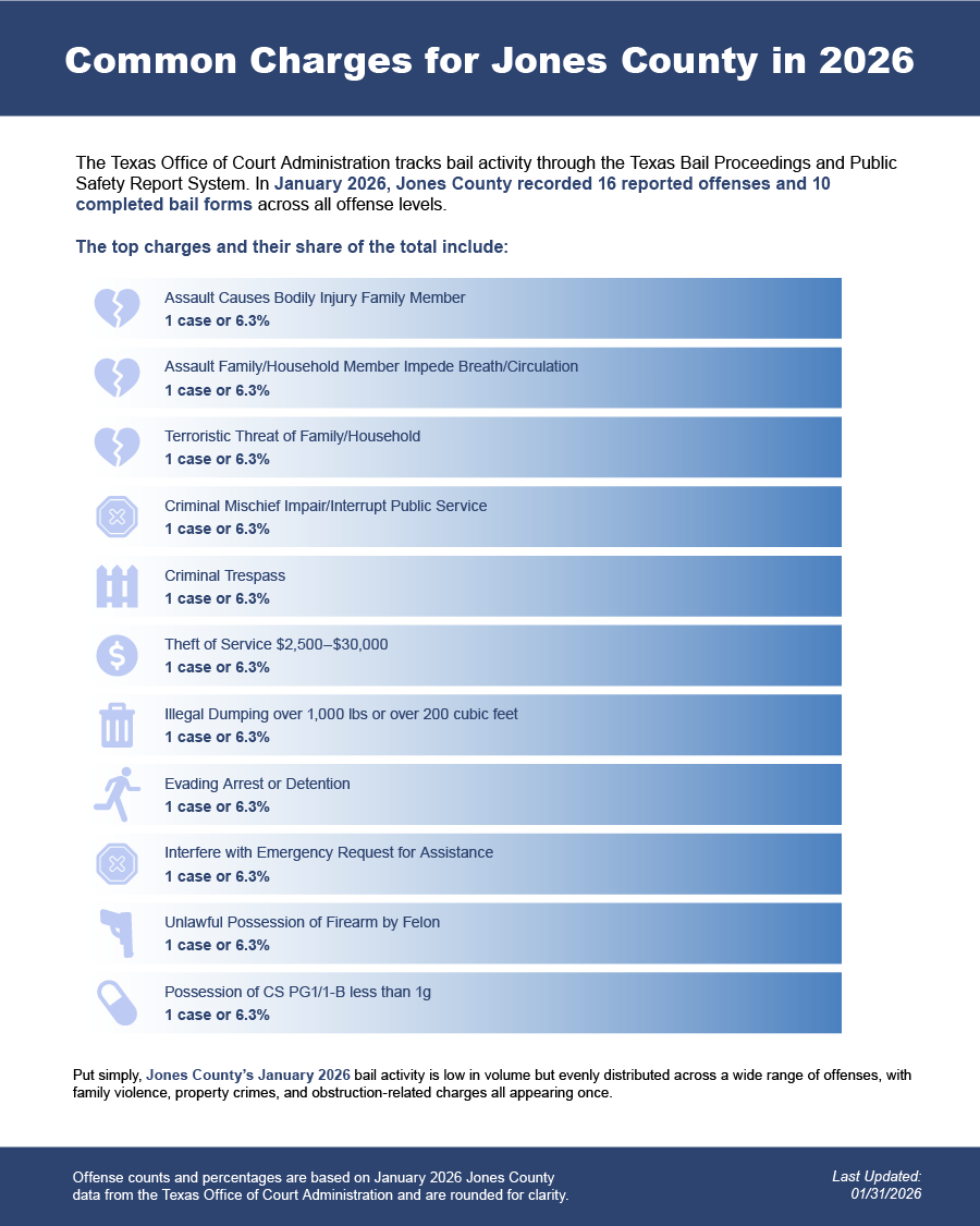 Bail bonds in Jones County, Texas may include felony bail bonds, misdemeanor bail bonds, and DWI bail bonds, depending on the charge and court requirements.
