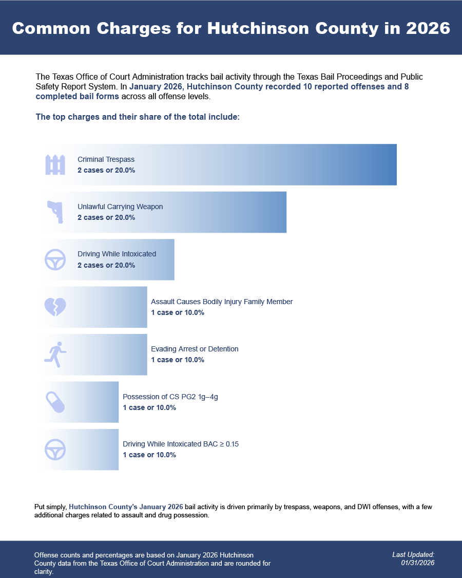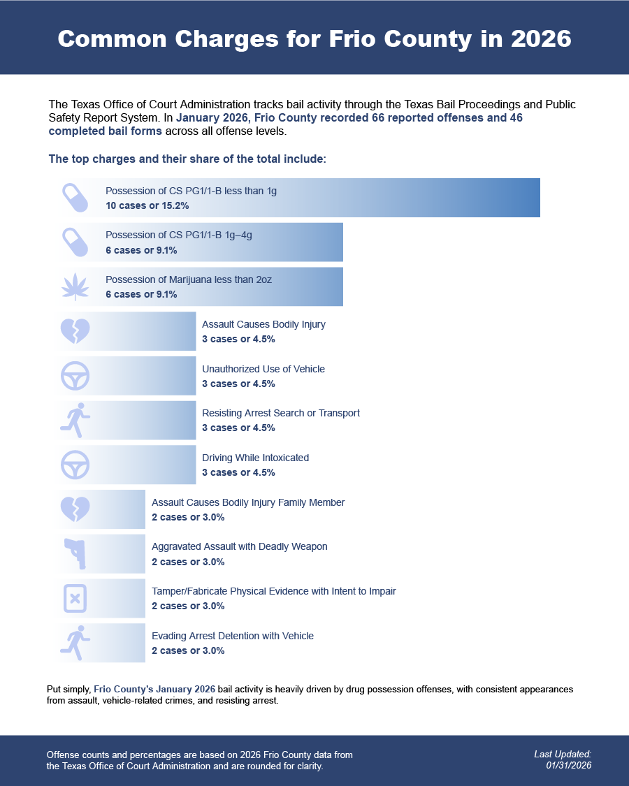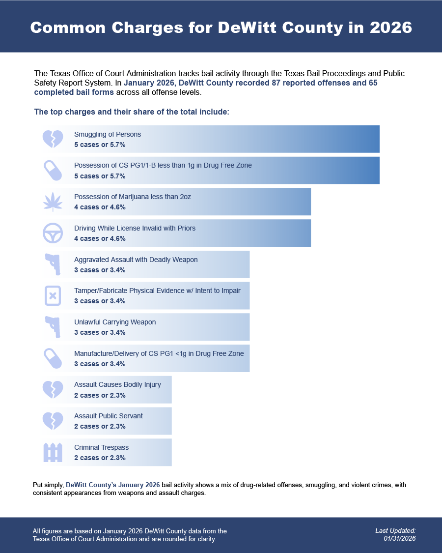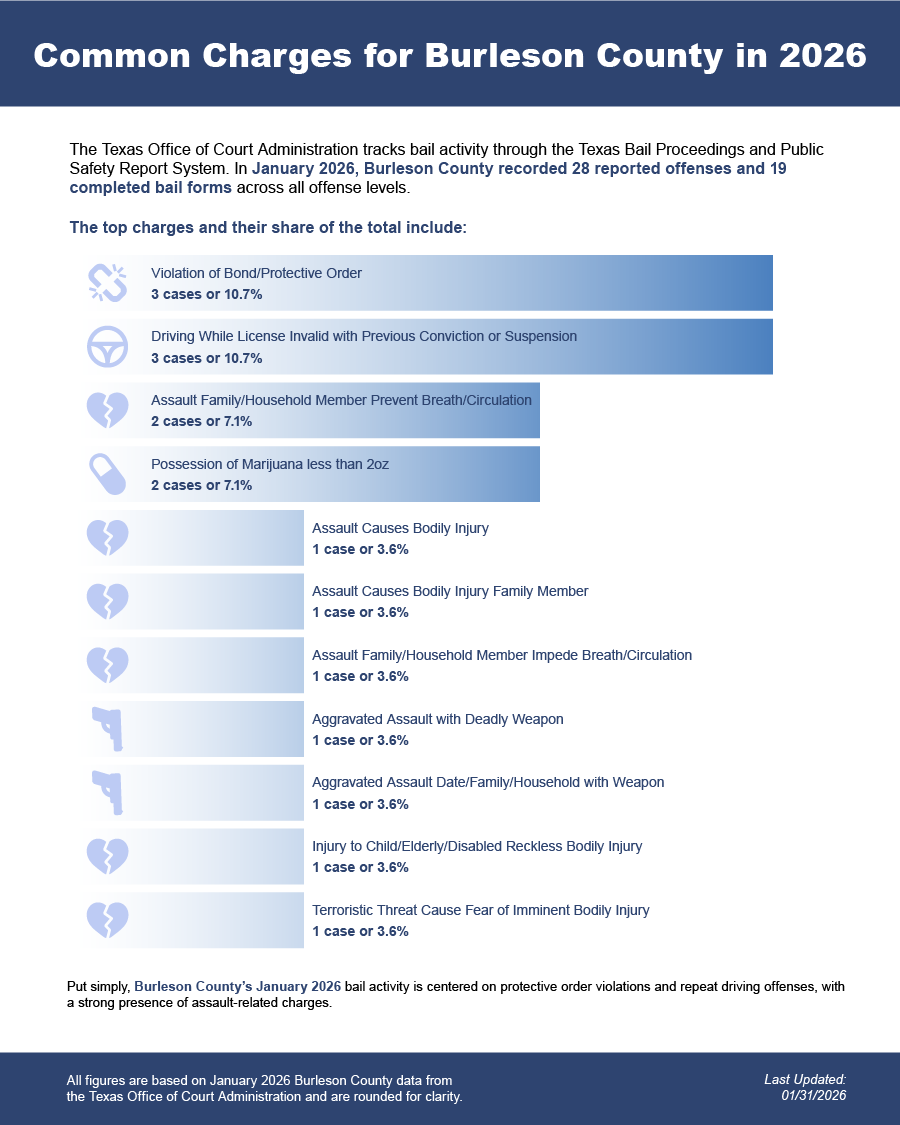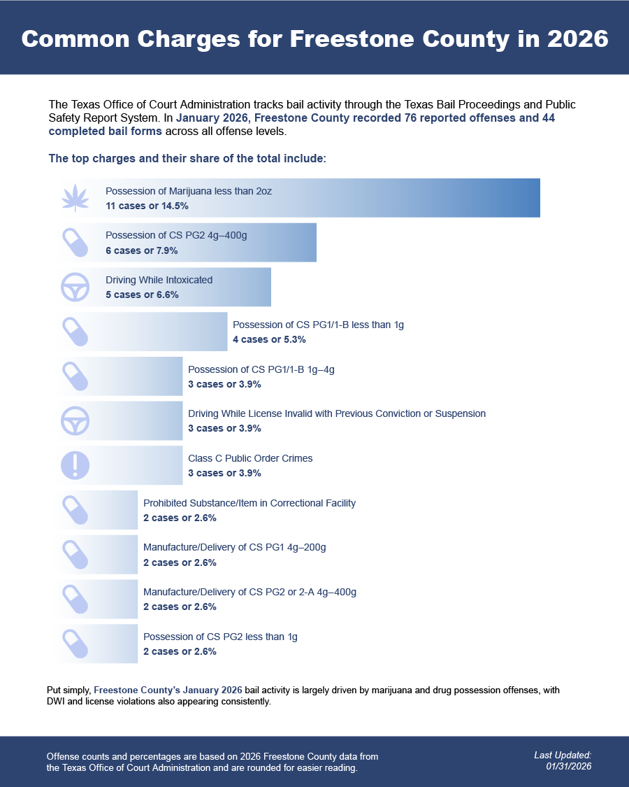 Bail bonds in Jones County, Texas may include felony bail bonds, misdemeanor bail bonds, and DWI bail bonds, depending on the charge and court requirements.