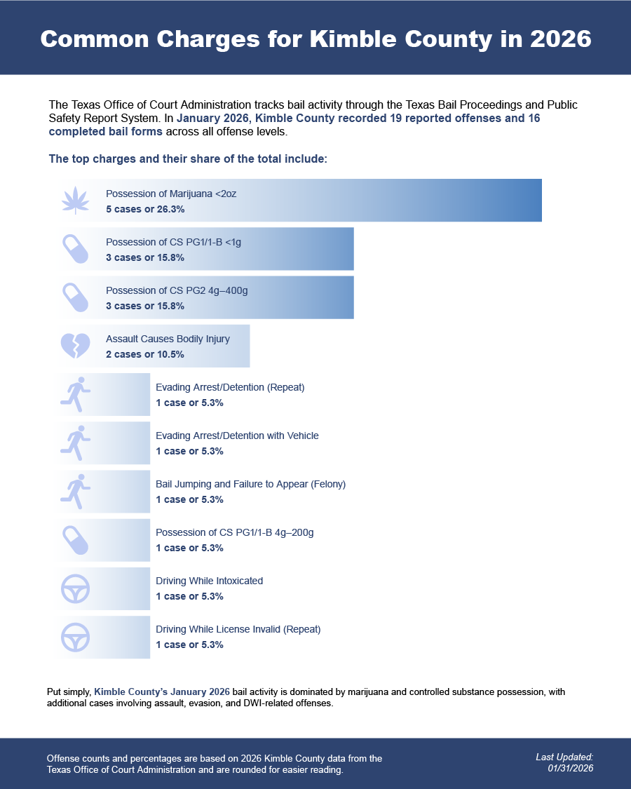 After an arrest in Kimble County, the booking process includes fingerprinting, photographing, and intake at a county detention facility such as the Kimble County County Jail. This process typically takes several hours. A magistrate or judge reviews the charge and sets bail, usually within 48 hours of arrest, either under a standard bail schedule or through a case-by-case review that considers the seriousness of the offense and the defendant’s history. - Contact Legal Guidance