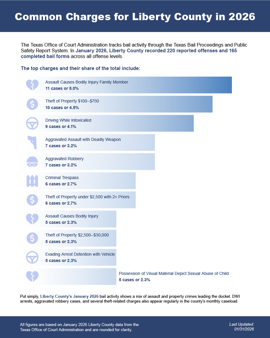 Bail bonds in Liberty County, Texas may include felony bail bonds, misdemeanor bail bonds, and DWI bail bonds, depending on the charge and court requirements.