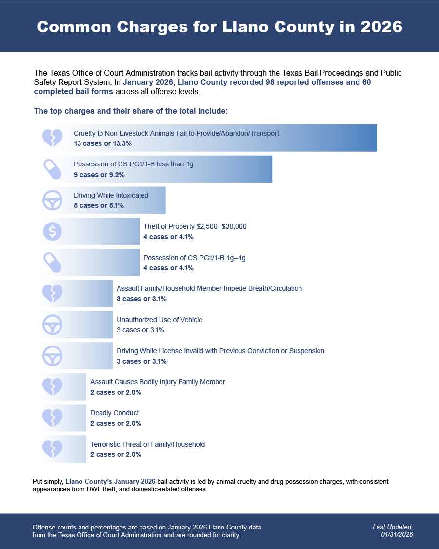 Bail bonds in Llano County, Texas may include felony bail bonds, misdemeanor bail bonds, and DWI bail bonds, depending on the charge and court requirements.