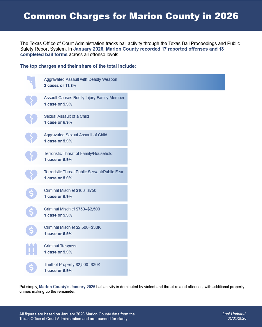 Bail bonds in Marion County, Texas may include felony bail bonds, misdemeanor bail bonds, and DWI bail bonds, depending on the charge and court requirements.