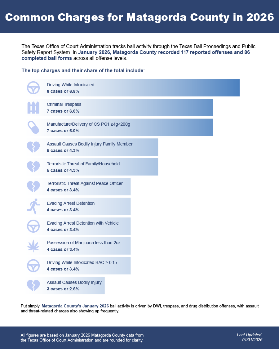 Bail bonds in Matagorda County, Texas may include felony bail bonds, misdemeanor bail bonds, and DWI bail bonds, depending on the charge and court requirements.