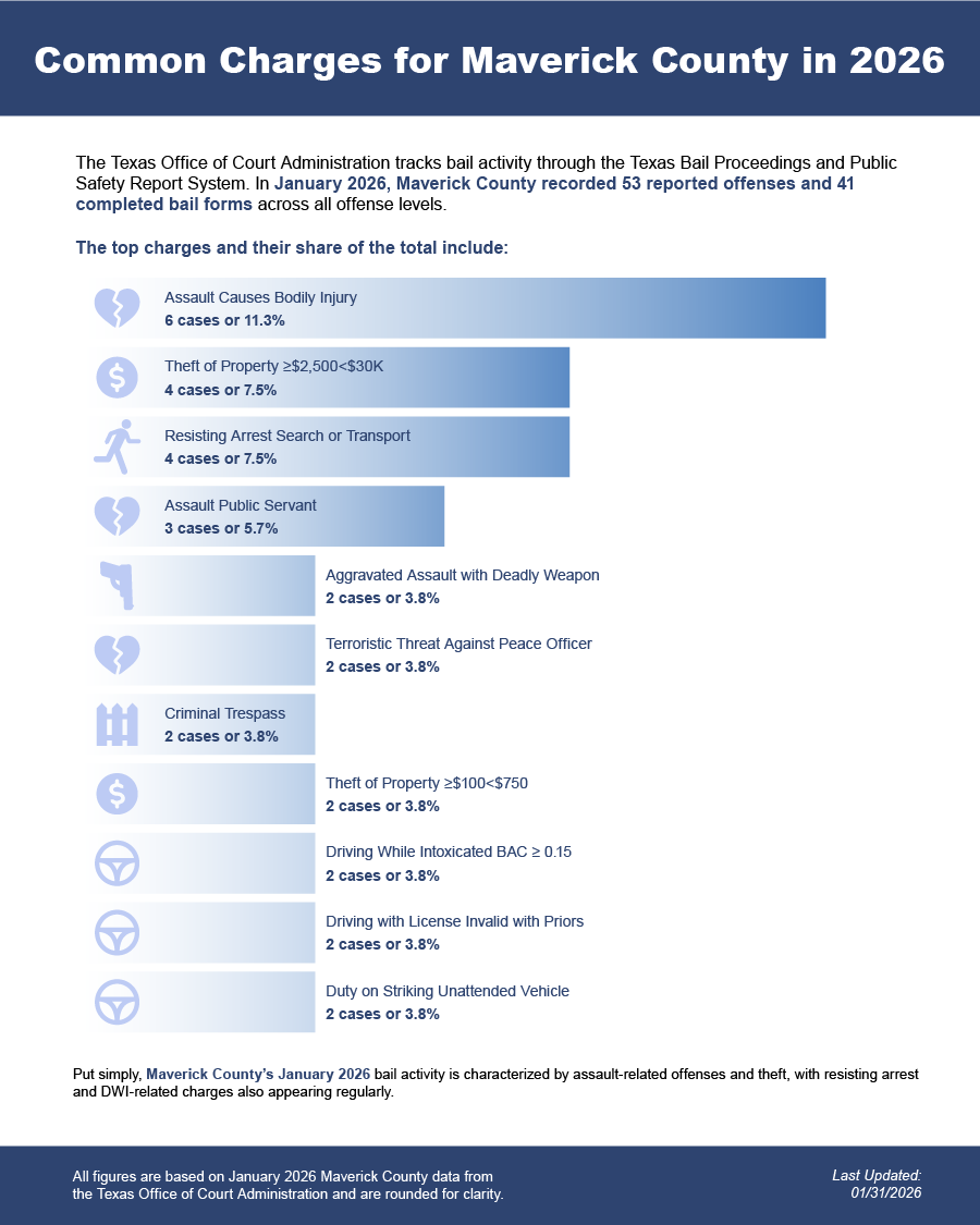 Bail bonds in Maverick County, Texas may include felony bail bonds, misdemeanor bail bonds, and DWI bail bonds, depending on the charge and court requirements.