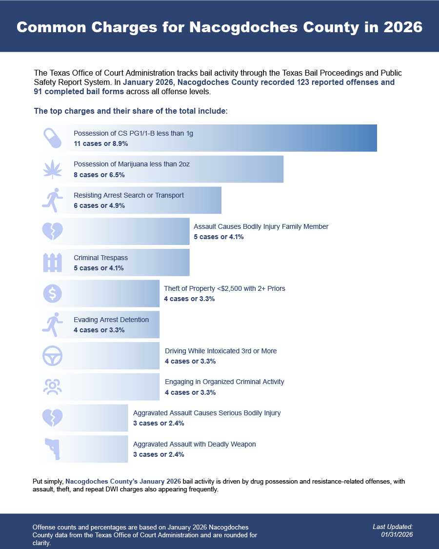 Bail bonds in Nacogdoches County, Texas may include felony bail bonds, misdemeanor bail bonds, and DWI bail bonds, depending on the charge and court requirements.