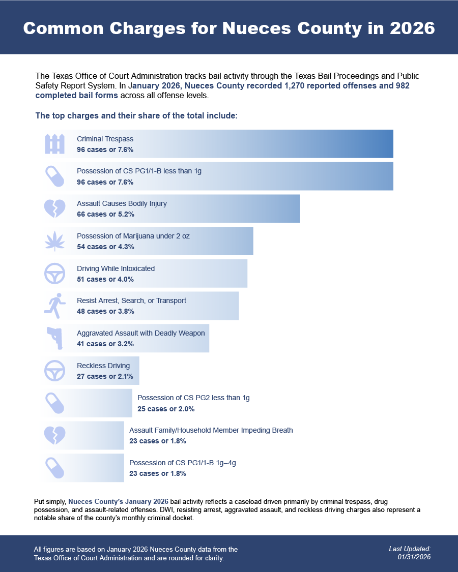 Bail bonds in Nueces County, Texas may include felony bail bonds, misdemeanor bail bonds, and DWI bail bonds, depending on the charge and court requirements.