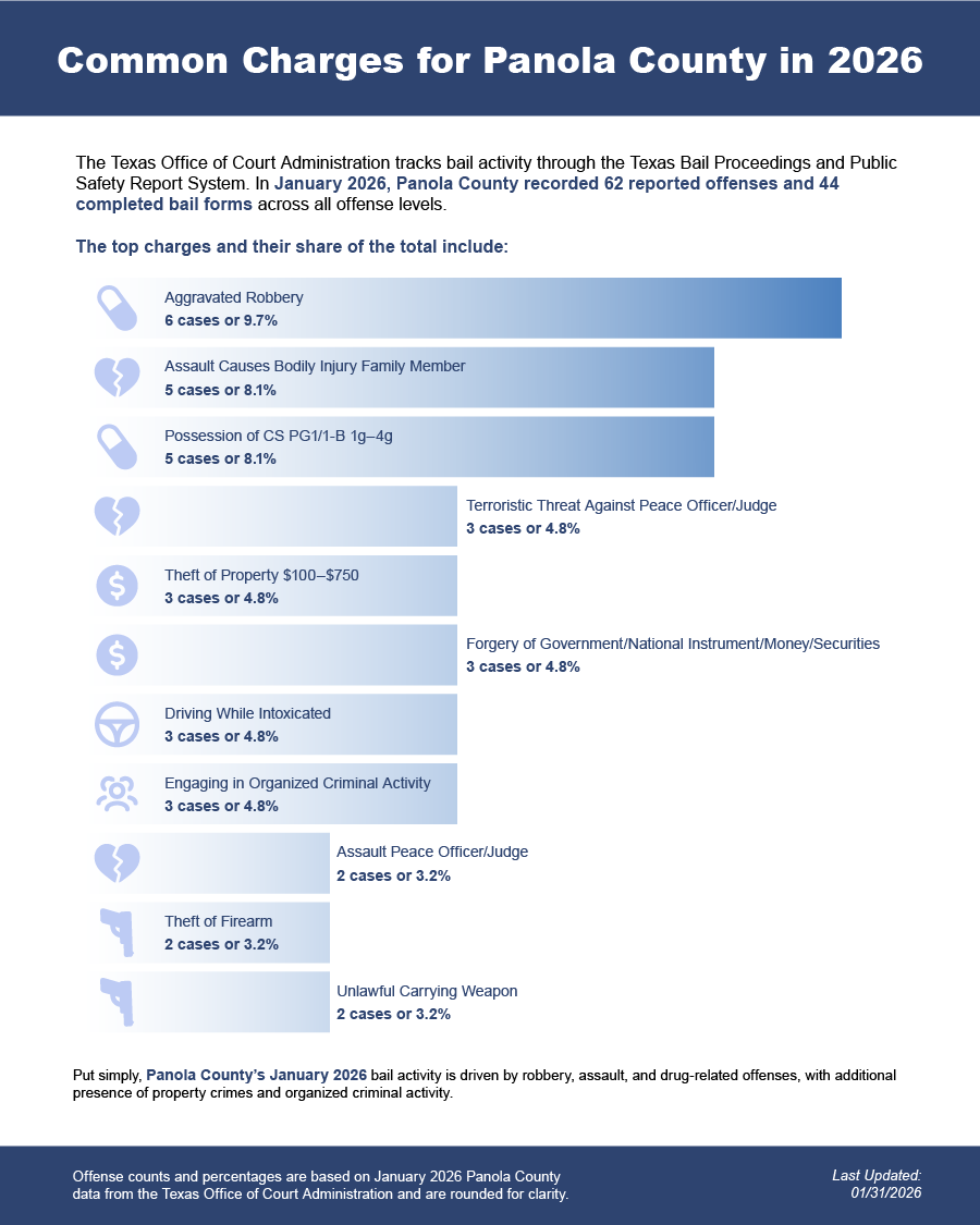 Bail bonds in Panola County, Texas may include felony bail bonds, misdemeanor bail bonds, and DWI bail bonds, depending on the charge and court requirements.