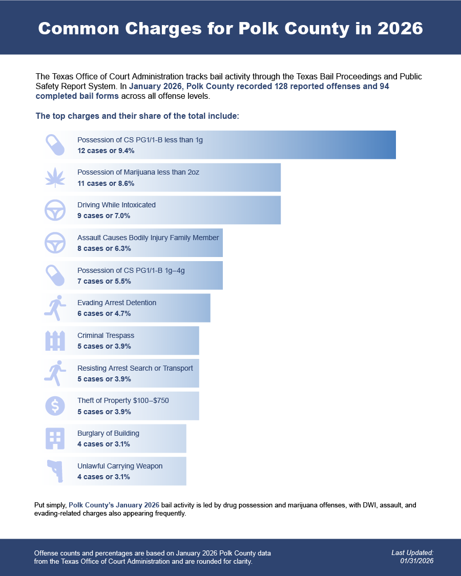 Bail bonds in Polk County, Texas may include felony bail bonds, misdemeanor bail bonds, and DWI bail bonds, depending on the charge and court requirements.