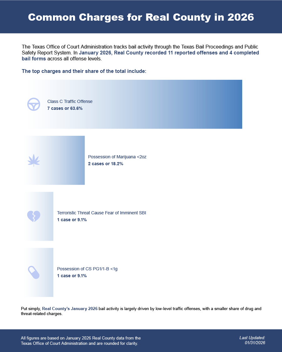 Bail bonds in Real County, Texas may include felony bail bonds, misdemeanor bail bonds, and DWI bail bonds, depending on the charge and court requirements.