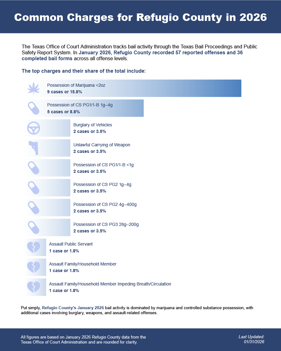 Bail bonds in Refugio County, Texas may include felony bail bonds, misdemeanor bail bonds, and DWI bail bonds, depending on the charge and court requirements.