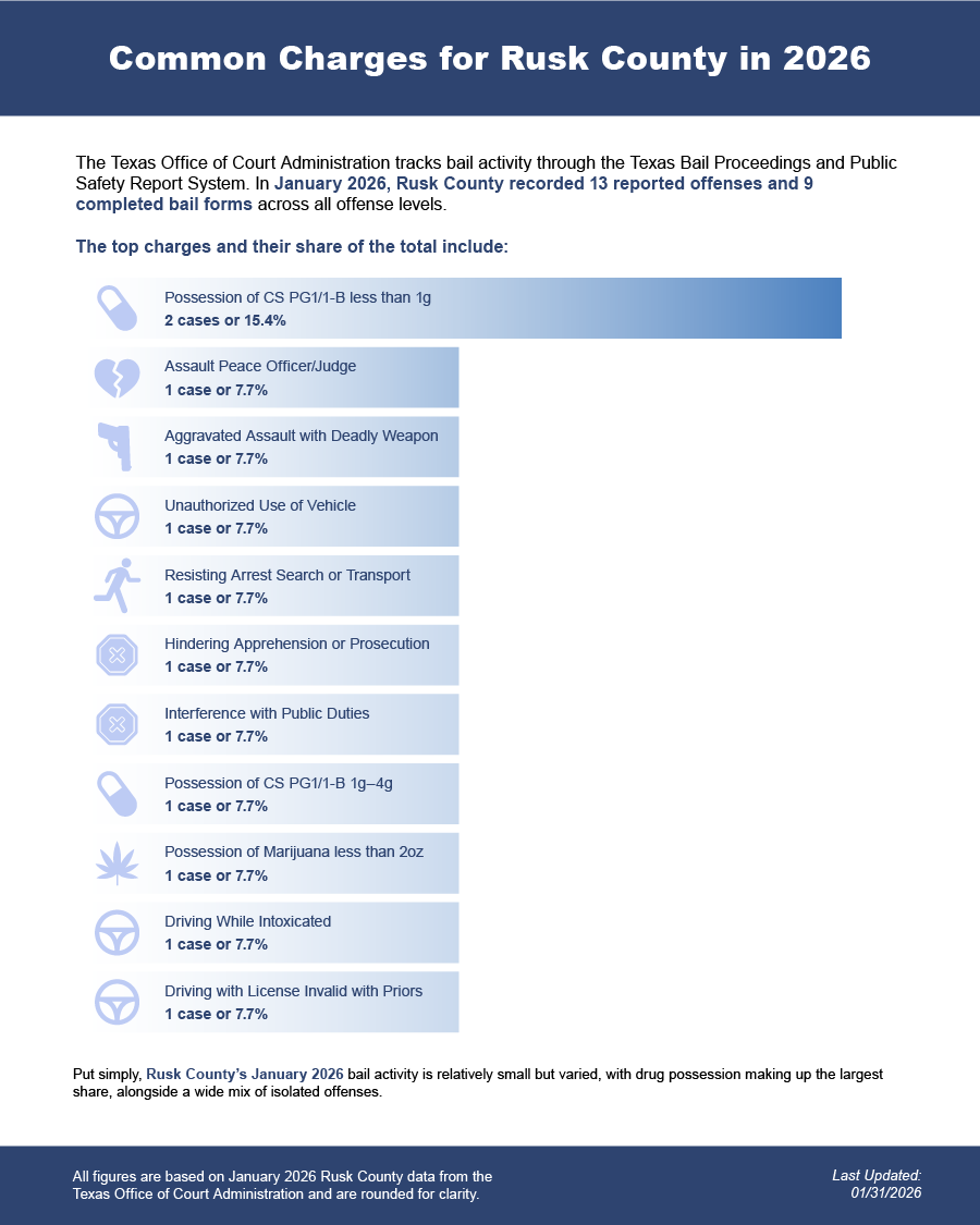 Bail bonds in Rusk County, Texas may include felony bail bonds, misdemeanor bail bonds, and DWI bail bonds, depending on the charge and court requirements.