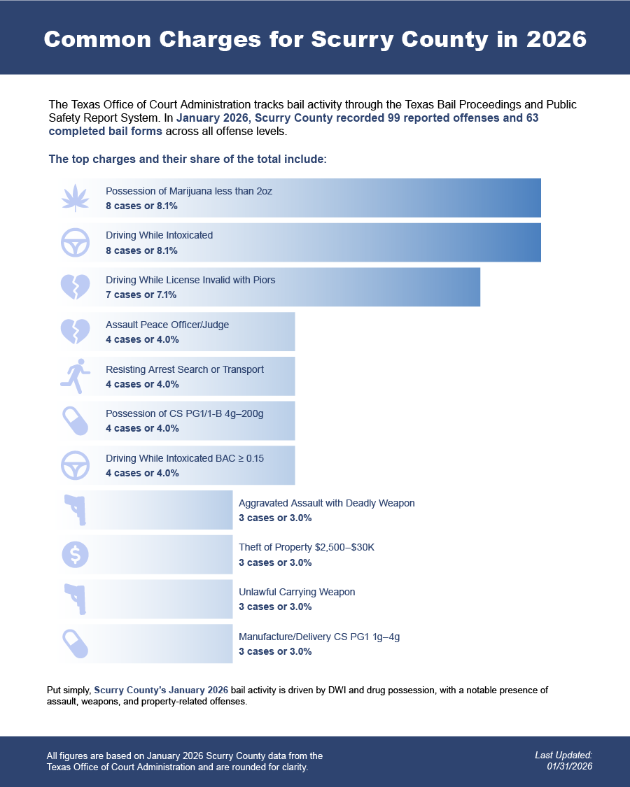 Bail bonds in Scurry County, Texas may include felony bail bonds, misdemeanor bail bonds, and DWI bail bonds, depending on the charge and court requirements.