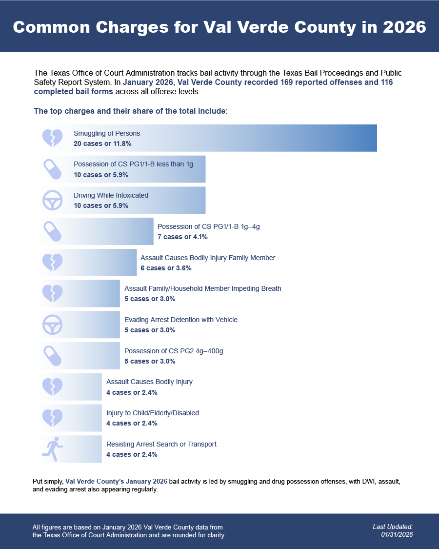 Bail bonds in Val Verde County, Texas may include felony bail bonds, misdemeanor bail bonds, and DWI bail bonds, depending on the charge and court requirements.