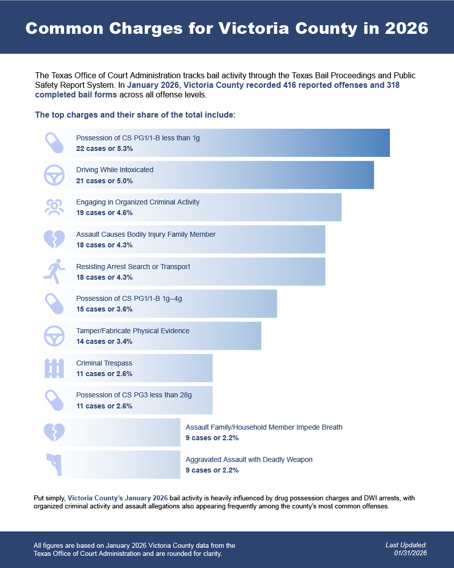 Bail bonds in Victoria County, Texas may include felony bail bonds, misdemeanor bail bonds, and DWI bail bonds, depending on the charge and court requirements.