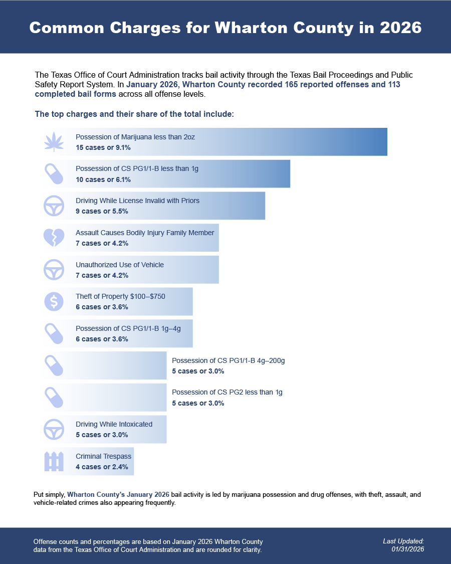 Bail bonds in Wharton County, Texas may include felony bail bonds, misdemeanor bail bonds, and DWI bail bonds, depending on the charge and court requirements.