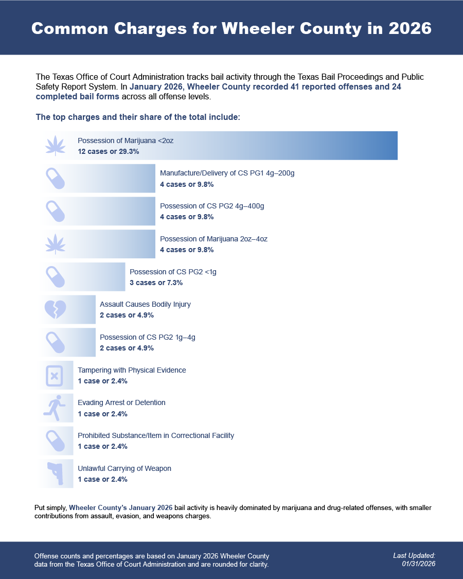 Bail bonds in Wheeler County, Texas may include felony bail bonds, misdemeanor bail bonds, and DWI bail bonds, depending on the charge and court requirements.