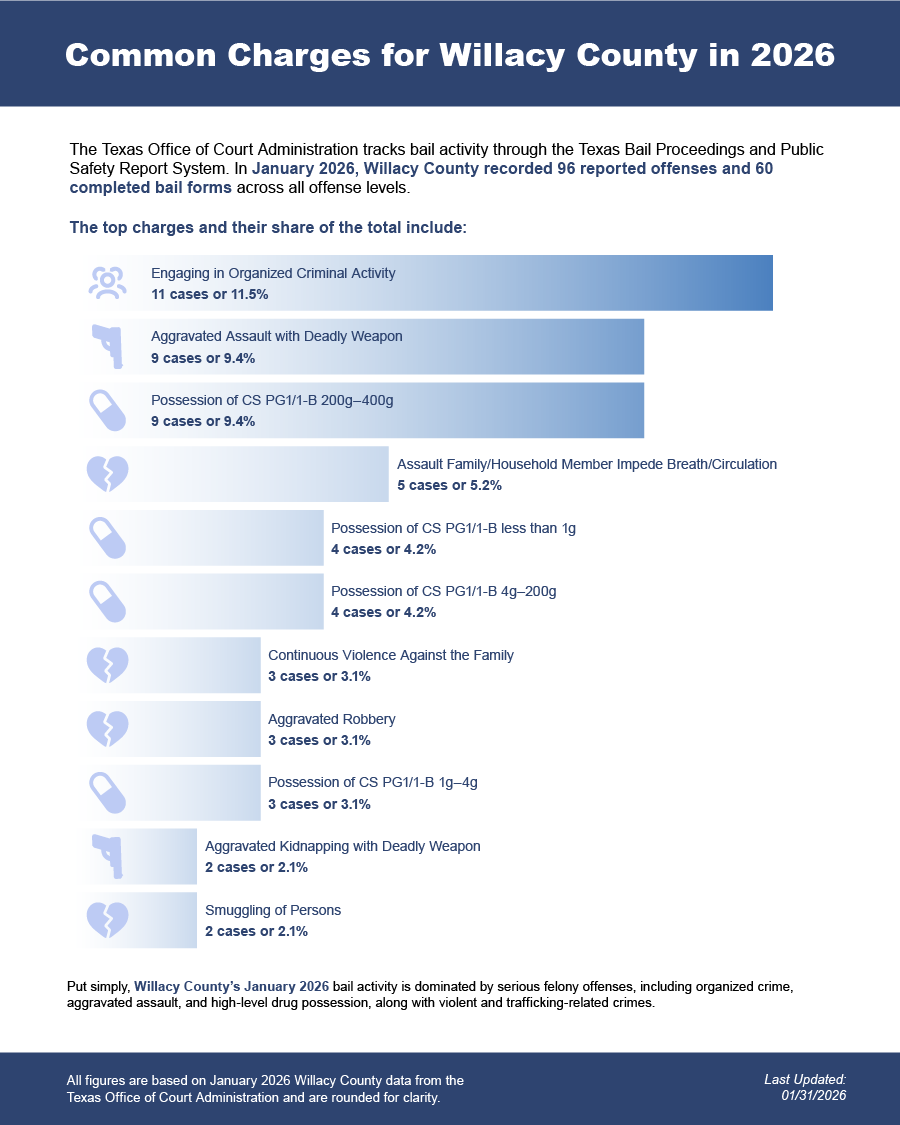 Bail bonds in Willacy County, Texas may include felony bail bonds, misdemeanor bail bonds, and DWI bail bonds, depending on the charge and court requirements.