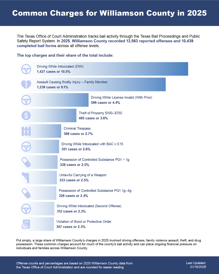 Bail bonds in Williamson County, Texas may include felony bail bonds, misdemeanor bail bonds, and DWI bail bonds, depending on the charge and court requirements.